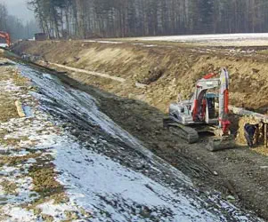 vorgängig eingebaute Trennschicht mit Lehm oder einer undurchlässigen Trennmatte soll austretendes Grundwasser im Böschungsbereich (Hangrutsche)